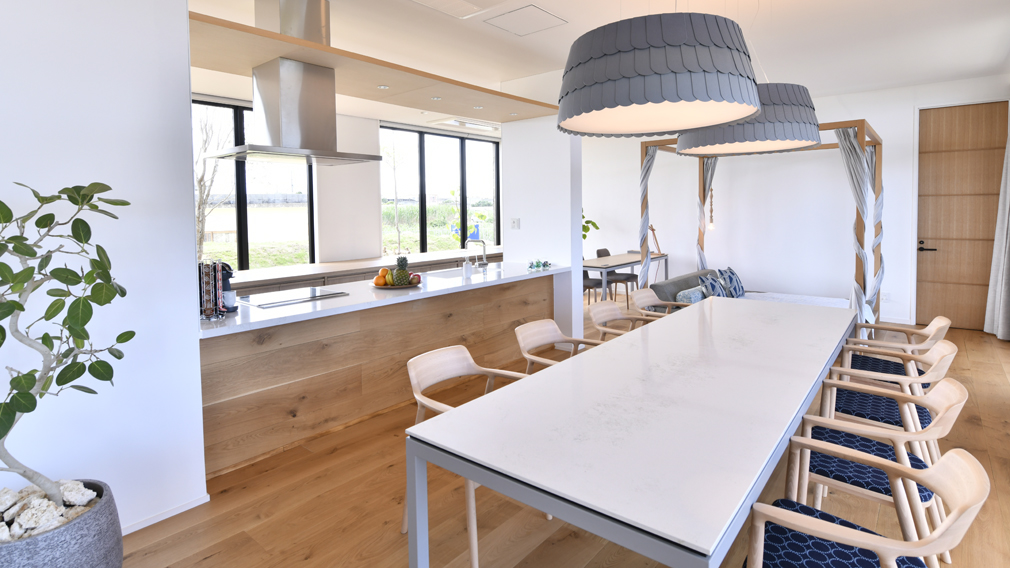 アイランド型のキッチンと一体となった広々ダイニング。佐和田の浜の風景をスパイスにお食事を楽しめます。