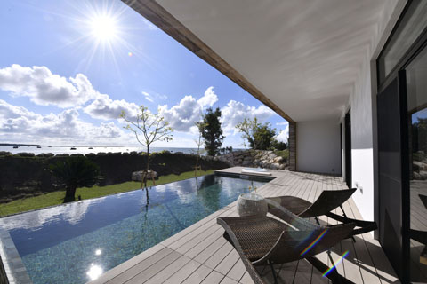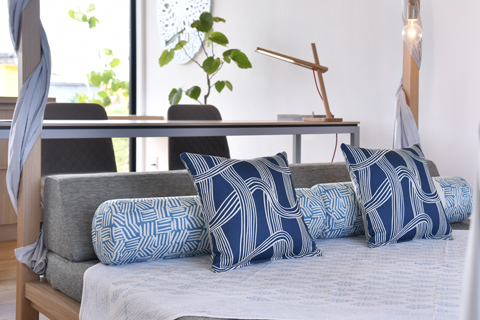 佐和田の浜を望み、夕陽や星空と寛げるデイベッド。沖縄ならではのテキスタイルのクッションをご用意しております。