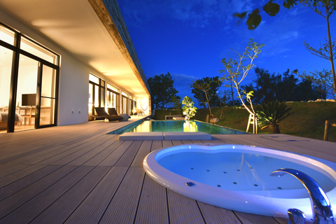 プールサイドにご用意したジャグジーでリゾートでのひと時を。夜には照明を付けてリラックスすることができます。