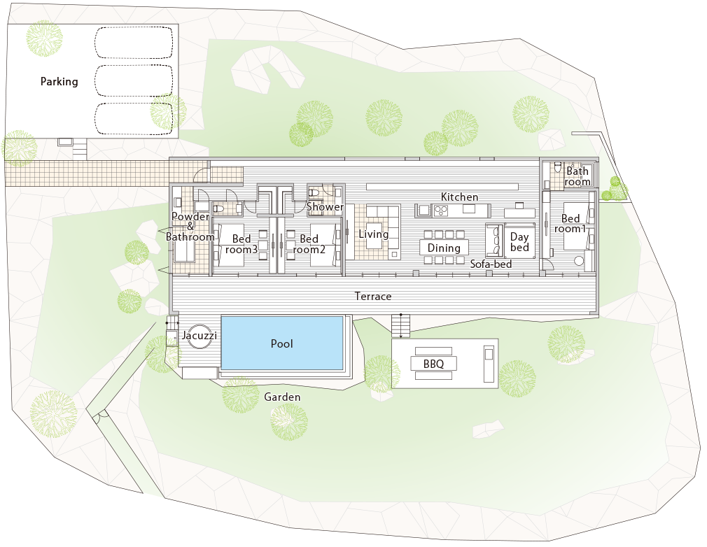 ・ベッドルーム(ツイン)×3室、デイベッド(ダブル)、ソファベッド(シングル)、プール、ジャグジー、テラス、ガーデン、バーベキューコーナー