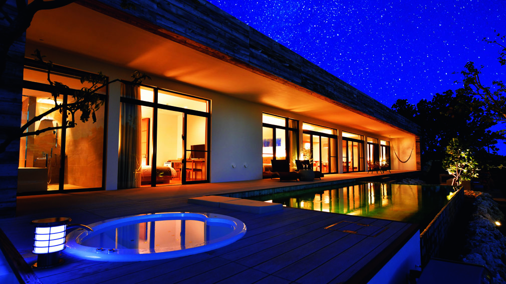 プールサイドにご用意したジャグジーでリゾートでのひと時を。夜には照明を付けてリラックスすることができます。